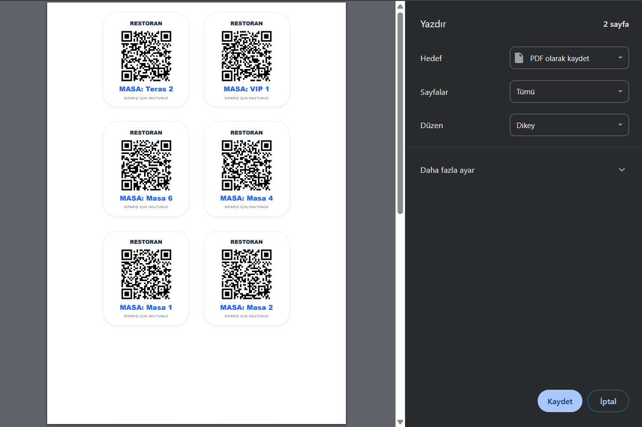 - Masalara tek tek veya toplu QR kod çıktısı alma