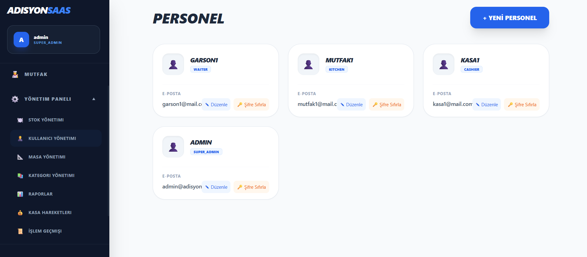 - Yönetici: Tüm yetkiler + raporlar, log kayıtları ve ciro takibi