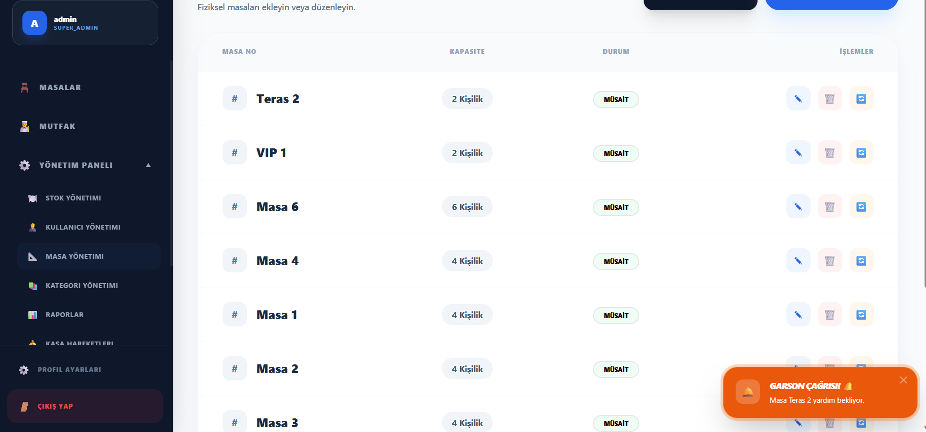 - Garson ekranında “Masa XXX çağırdı” bildirimi görünür