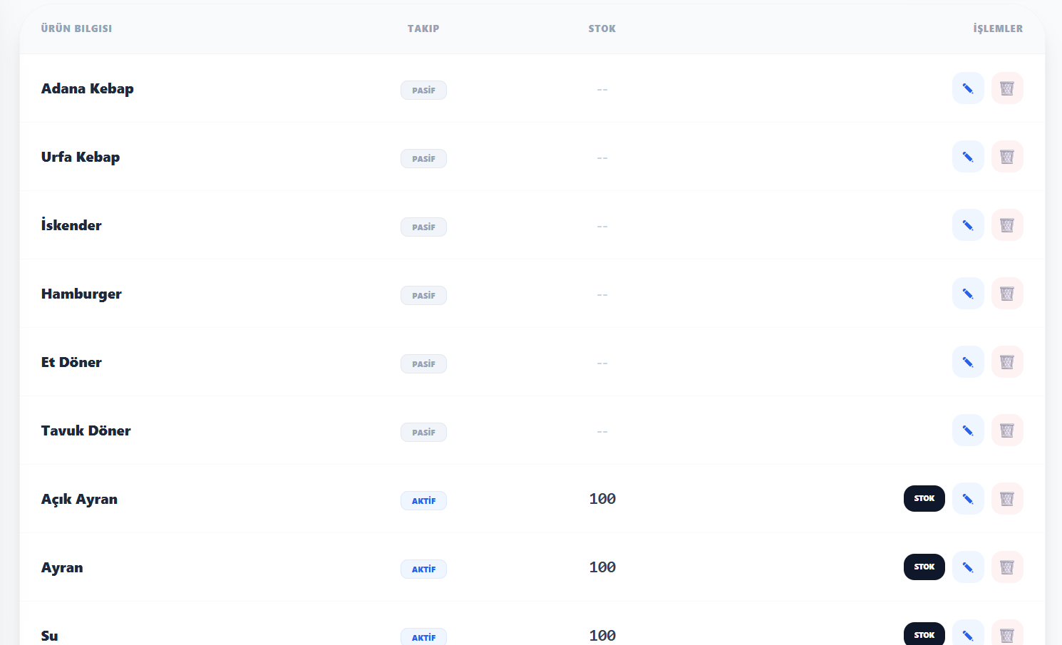 - Stoklu ürün takibi (örneğin su, ayran vb.)