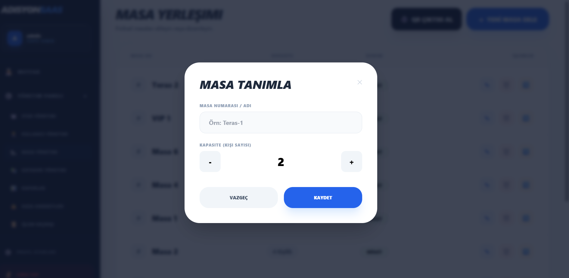 - Yeni masa tanımlama