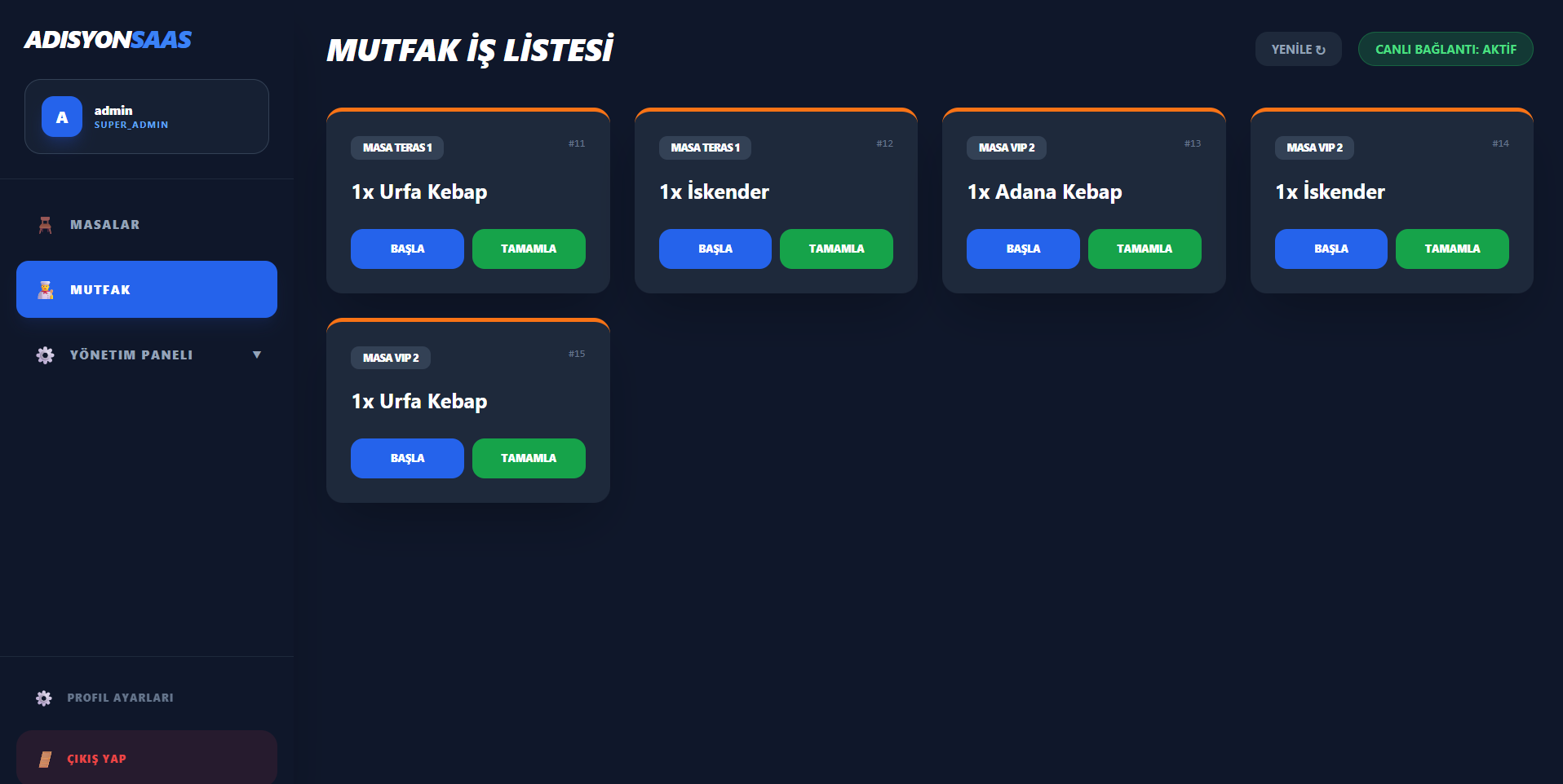 - Mutfak ekranında aktif siparişler masa adı ile görüntülenir